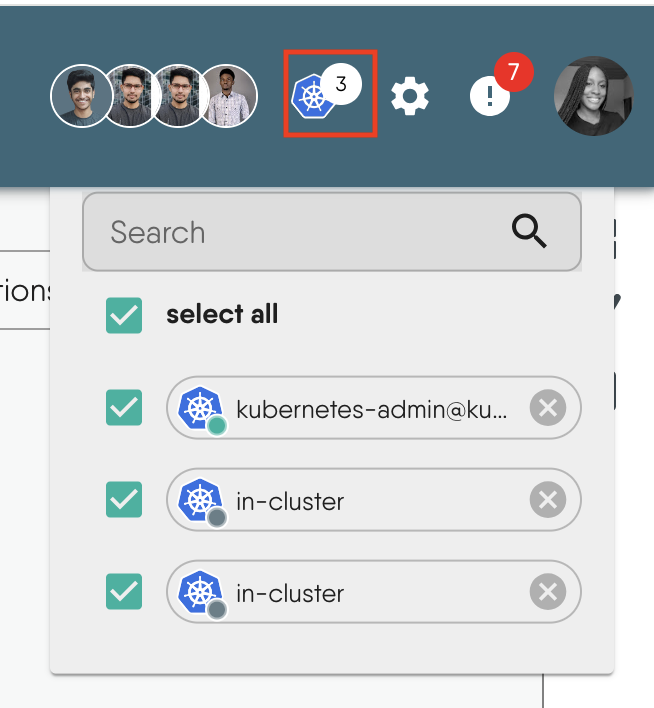 The Kubernetes connection icon at the top right corner of the screen shows the list of connected Kubernetes clusters. Clicking on the icon will invoke an ad hoc connectivity test between your Meshery Server and the specific Kubernetes cluster. Should this check fail, verify the health of your Meshery Operator deployment within that cluster.